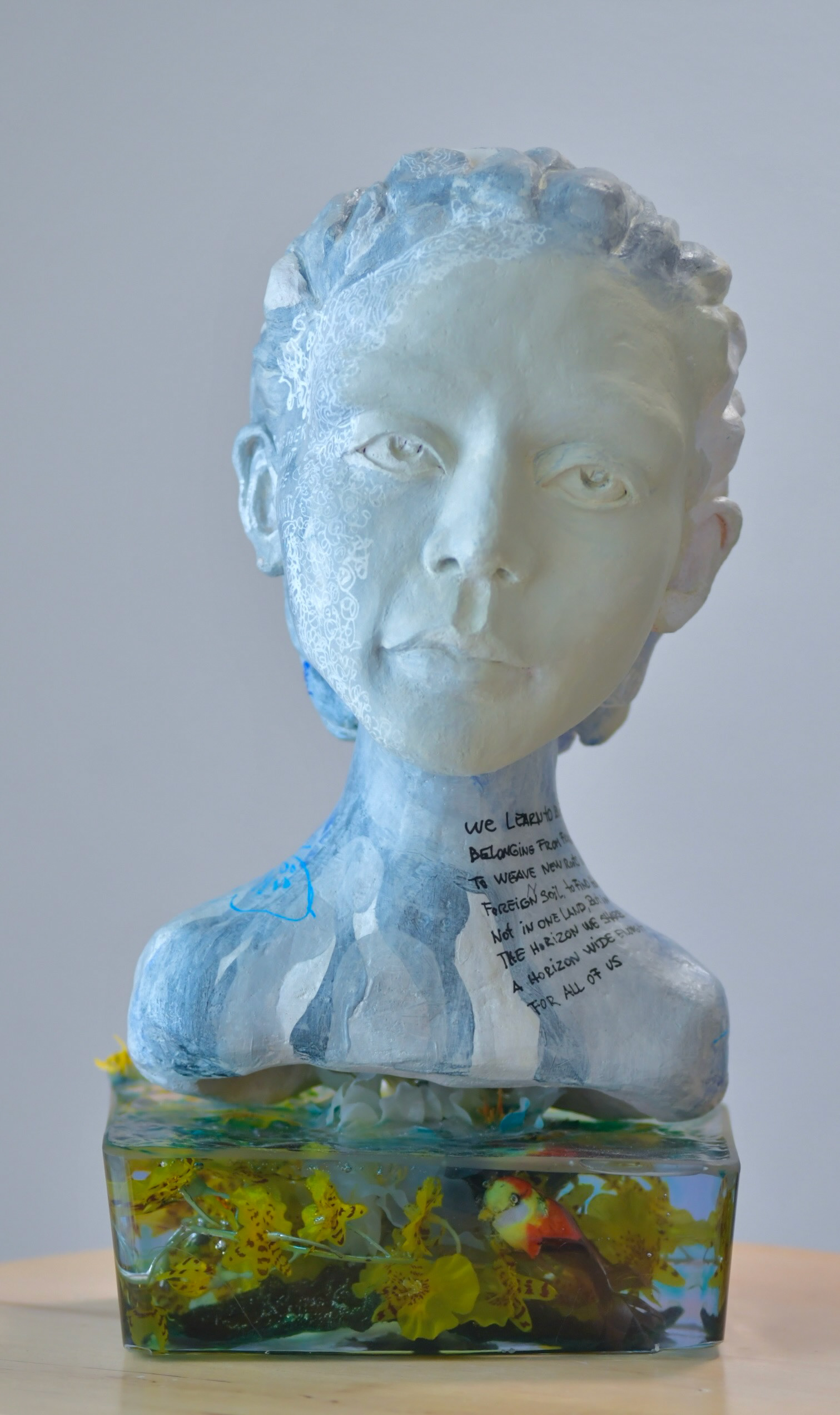 The surface of her face carries the softness of mist and the patience of stone, washed in pale blues