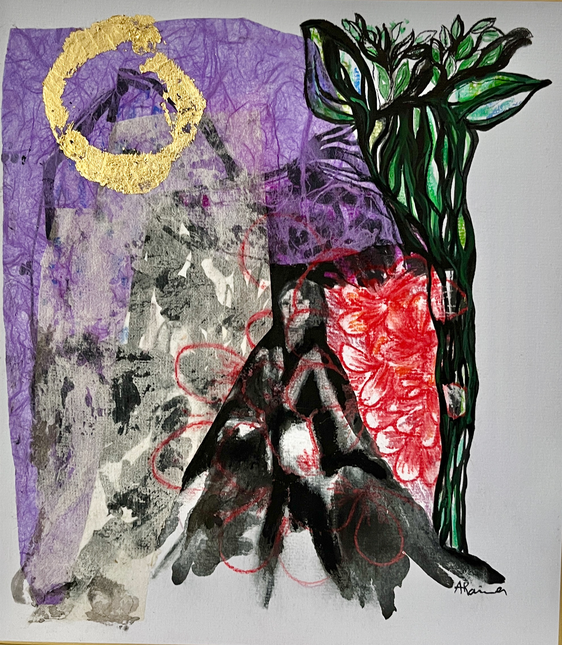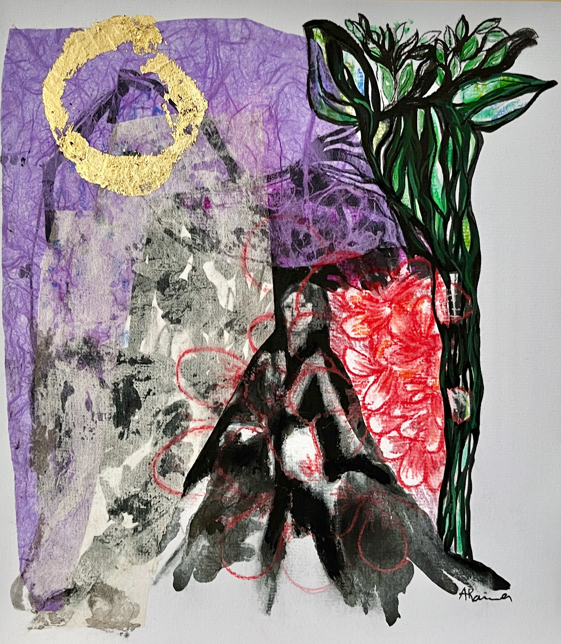 Mixed Media, Paper, Ink, Gold leaf, Pencil on Shikishi paper